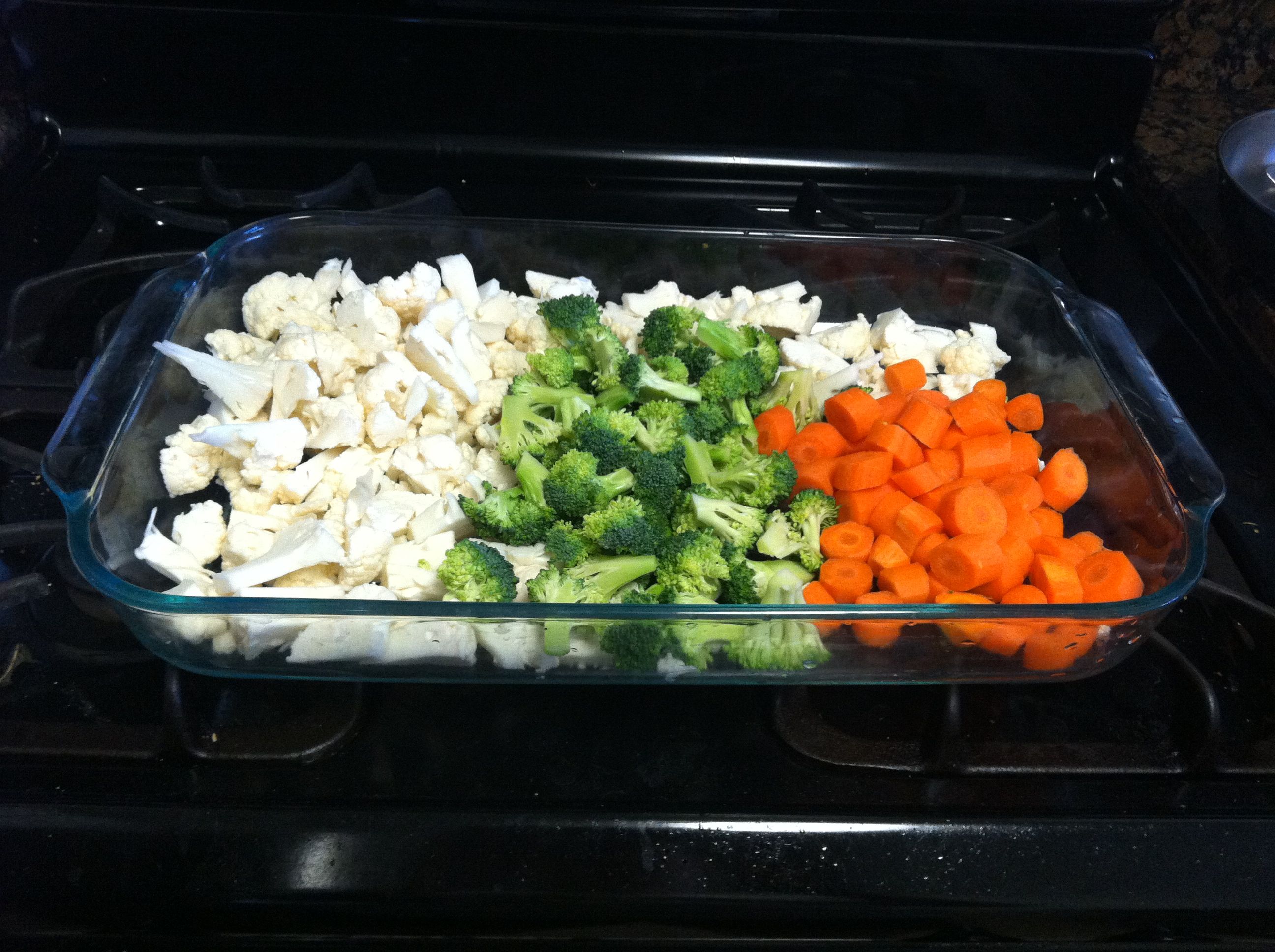 Prepare the chicken first (it can even be done the night before – a lot of times I’ll use whatever leftover chicken I have for this recipe). Lightly coat chicken with coconut oil and several cloves of crushed garlic – the amount can vary depending on how much garlic you like. Add salt and pepper to taste, and bake at 350 for about 45 minutes.